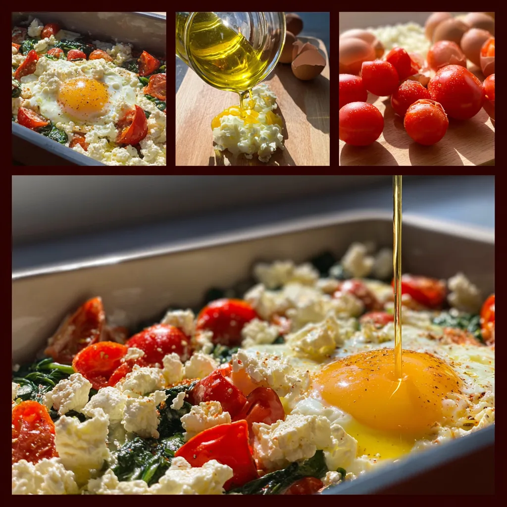 A wholesome and flavorful baked dish combining creamy feta cheese, eggs, spinach, and juicy tomatoes, perfect for a nutritious breakfast or brunch.