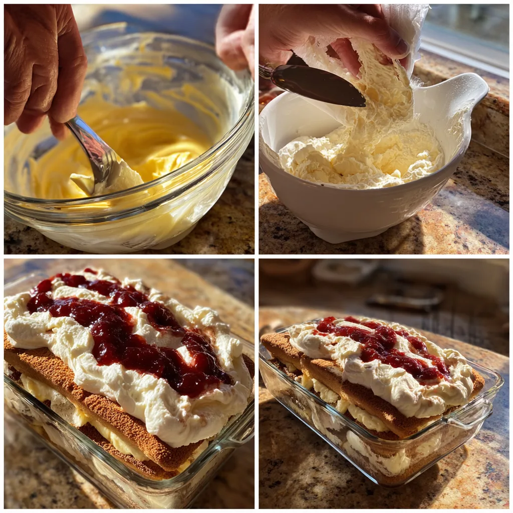 - In another bowl, mix mascarpone, sugar, and vanilla until smooth. Gently fold in whipped cream.