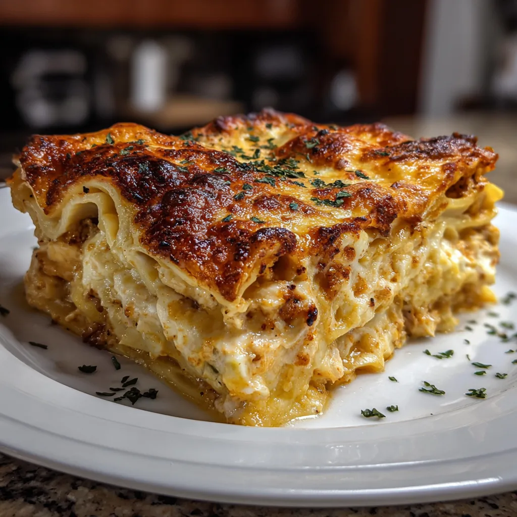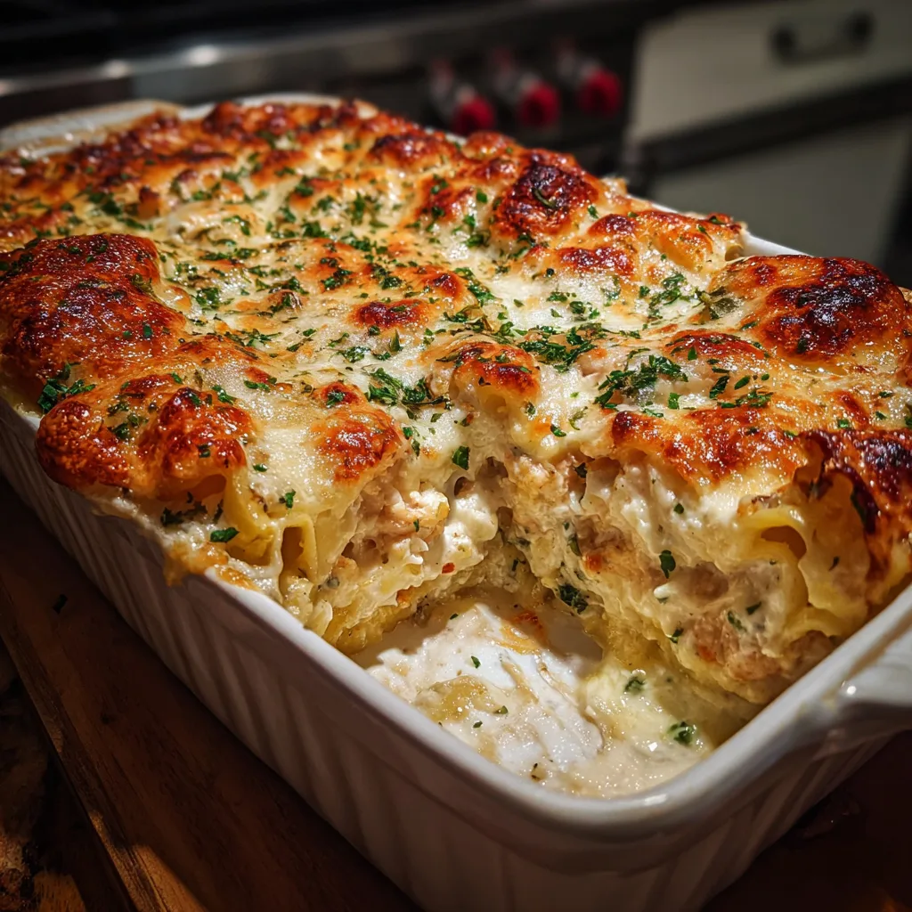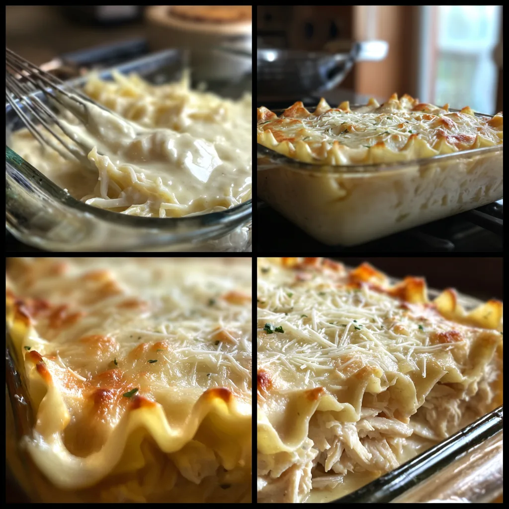 Chicken Alfredo Lasagna is a creamy, comforting baked dish made with layers of tender chicken, lasagna noodles, rich Alfredo sauce, and melted cheese for a hearty family-style meal.