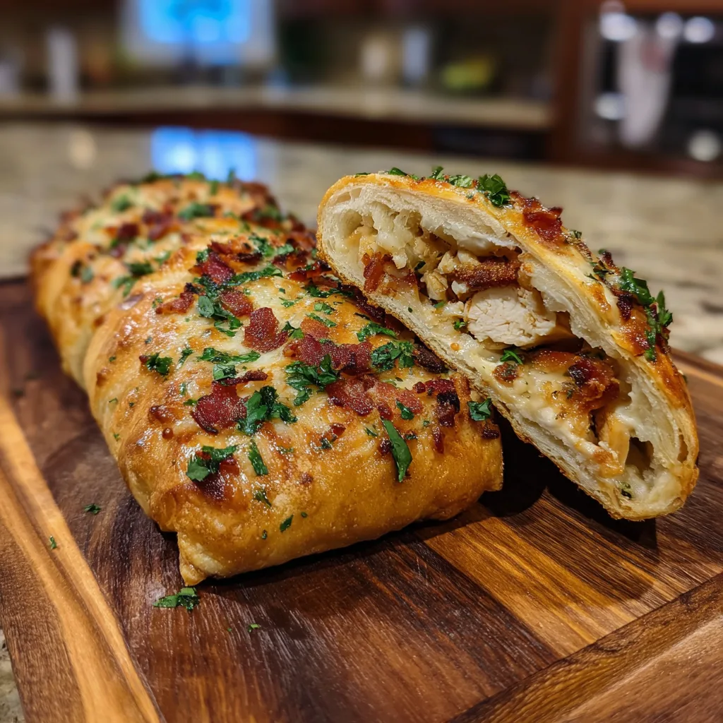 Chicken Bacon Ranch Stromboli is a savory baked roll filled with tender chicken, crispy bacon, gooey cheese, and creamy ranch dressing, wrapped in golden pizza dough.
