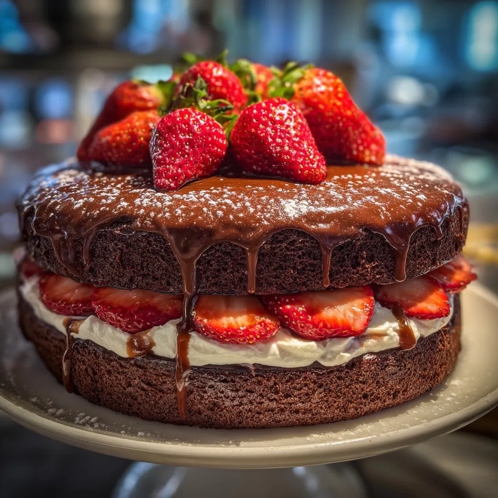 A rich and moist chocolate cake layered with a sweet and tangy strawberry filling, finished with a smooth chocolate frosting for a classic and elegant dessert.