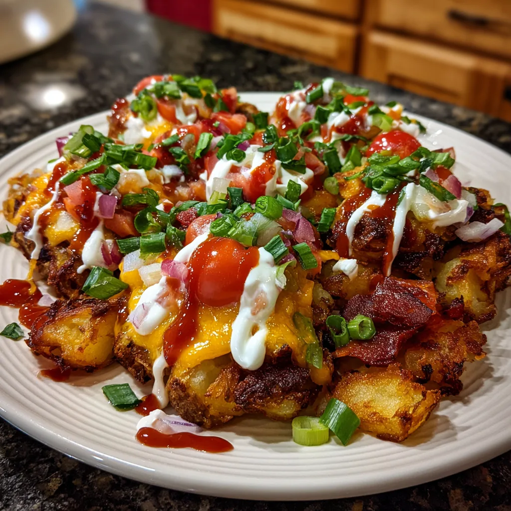 Golden, crispy hashbrowns piled high with classic loaded baked potato toppings like melted cheddar, crispy bacon, sour cream, and fresh green onions. A hearty and satisfying breakfast, brunch, or game-day side dish.