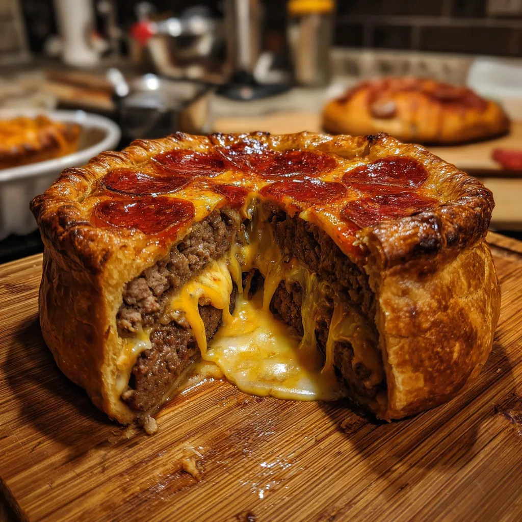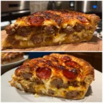 There is something deeply satisfying about a thick, oven-baked meat pie loaded with layers of savory flavors and melted cheese. This Deep Hamburger, Sausage & Pepperoni Pie is the kind of dish that feels indulgent, comforting, and perfect for sharing. It combines three classic meats into one rich, cohesive filling, surrounded by a golden, crisp crust that holds everything together beautifully. I first made this pie on a cold evening when I wanted something filling but familiar, and it quickly became a household favorite. The combination of seasoned ground beef, Italian sausage, and pepperoni creates depth without being overwhelming, while the cheese binds everything into a sliceable, satisfying meal. This recipe works equally well for family dinners, casual gatherings, or meal prep for the week. Each bite is hearty, flavorful, and unapologetically comforting, making it a reliable go-to when you want something substantial and crowd-pleasing.