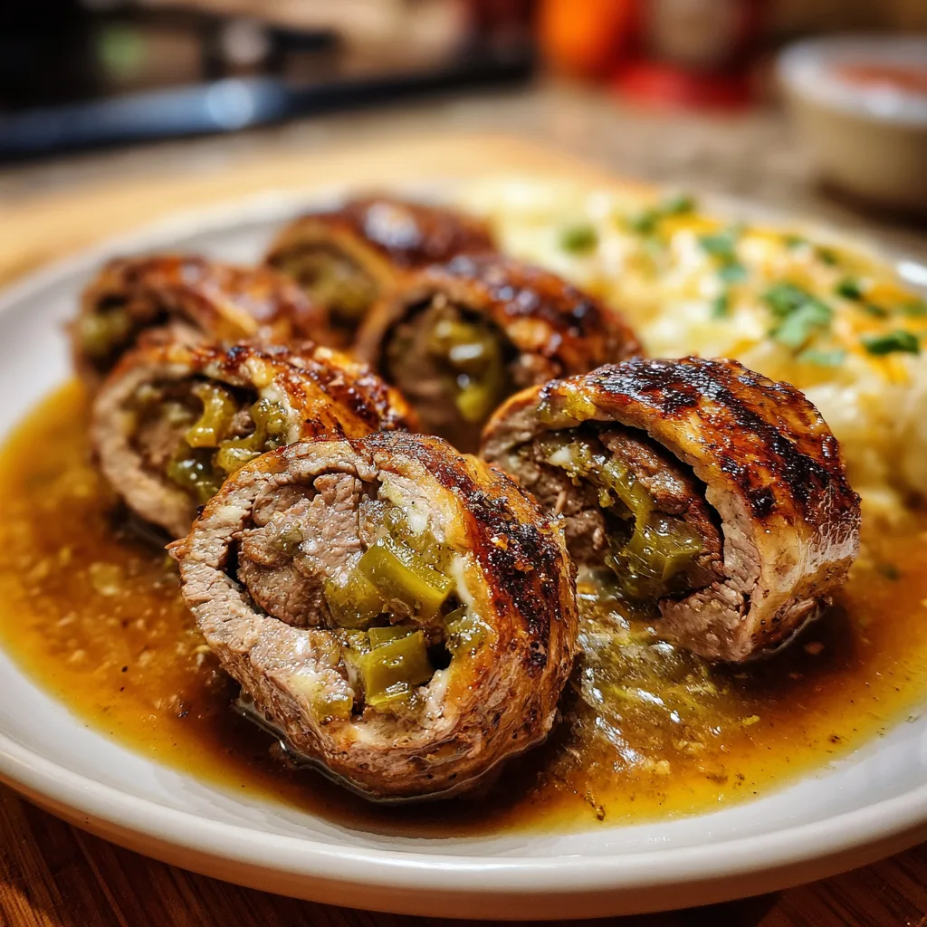 Savory steak roll ups stuffed with green chiles, cheese, and a flavorful filling, then seared and baked until tender. A delicious and satisfying dish with a mild spicy kick.