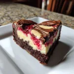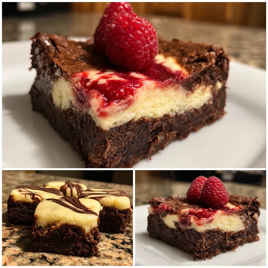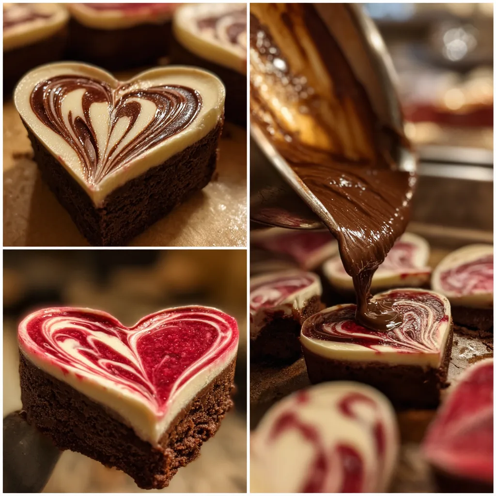 Rich, fudgy heart-shaped brownies layered with deep chocolate flavor, topped with a creamy cheesecake layer and finished with a tangy raspberry swirl for a beautiful and indulgent dessert.