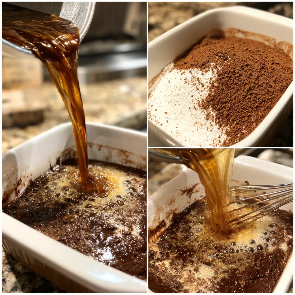 Hot water activates the cocoa and sugar topping, creating the signature fudge sauce as the cake bakes.