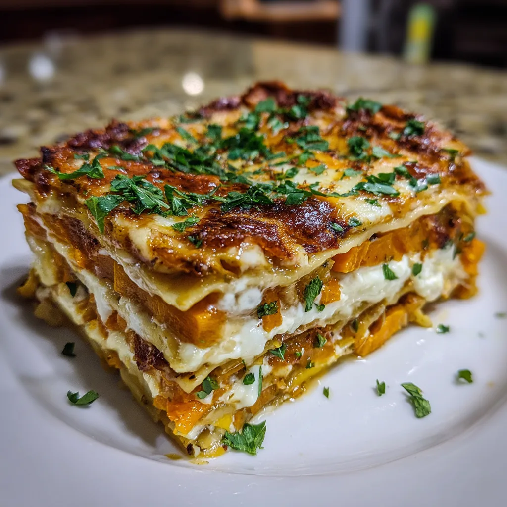 A wholesome and colorful vegetable lasagna layered with sweet potatoes, butternut squash, carrots, creamy cheese, and savory sauce. This hearty dish is rich in flavor and perfect for a comforting vegetarian meal.
