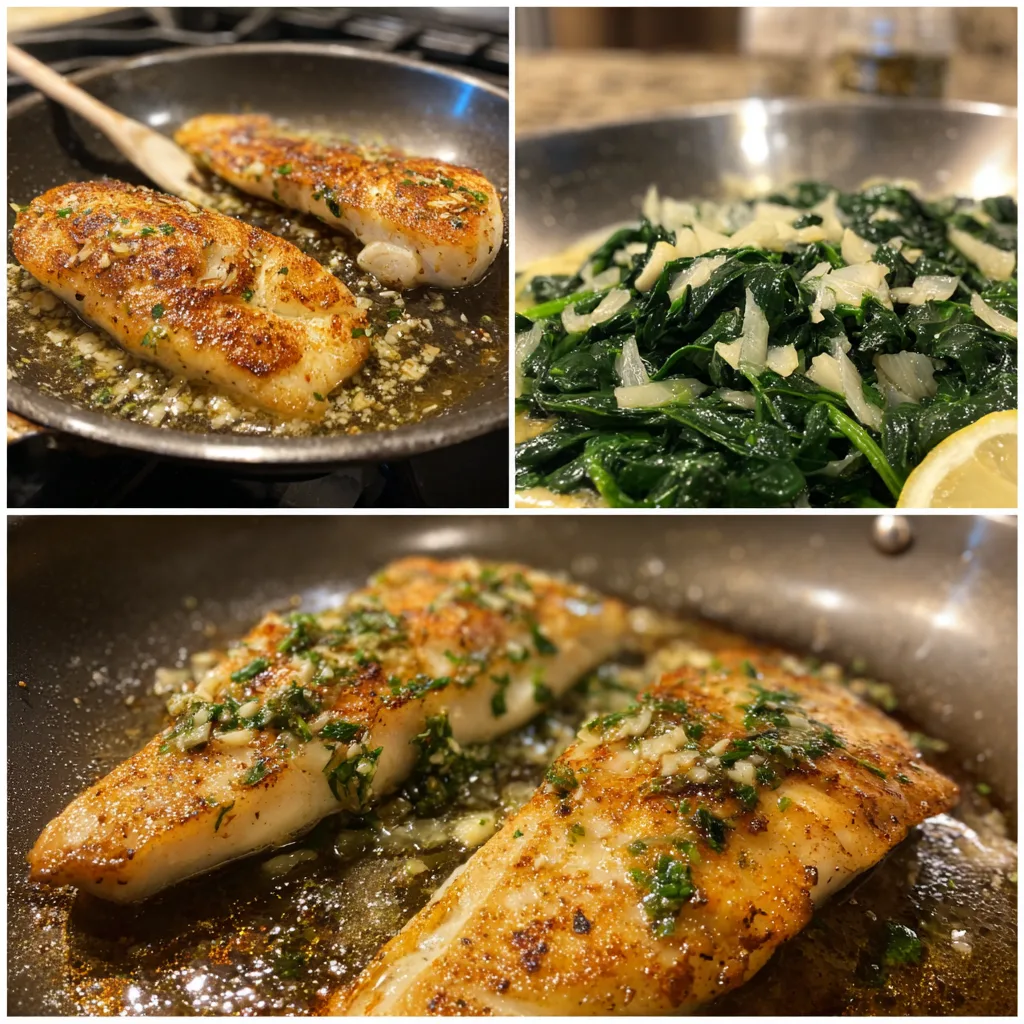 For the creamed spinach, use a separate pan or the same one after removing the fish. Melt butter over medium heat, then add fresh spinach and cook until wilted. Stir in the heavy cream and let it simmer gently until slightly thickened. Add grated Parmesan cheese, mixing until smooth and creamy.