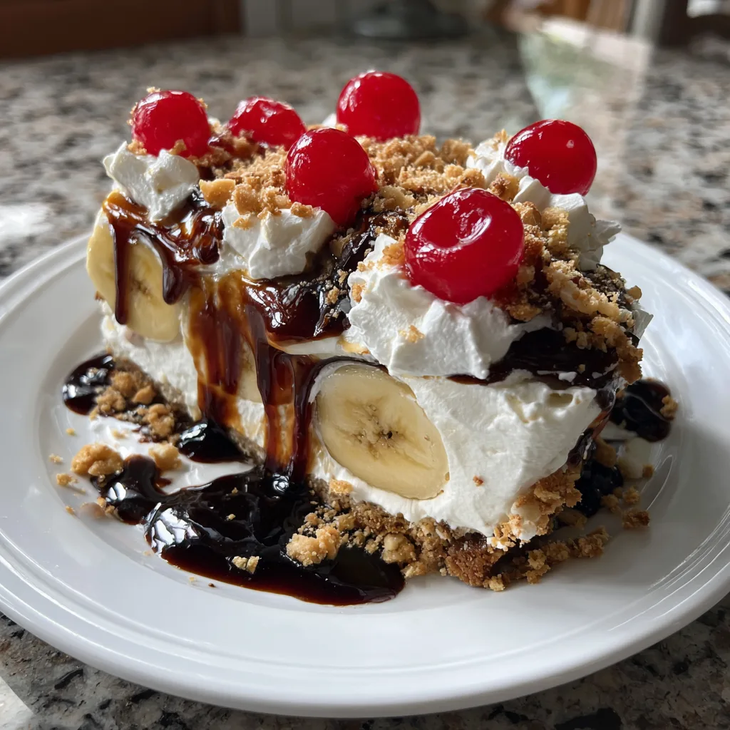 A classic no-bake layered dessert inspired by the banana split, featuring a buttery graham cracker crust, creamy cheesecake filling, fresh bananas, pineapple, and whipped topping finished with chocolate and cherries.