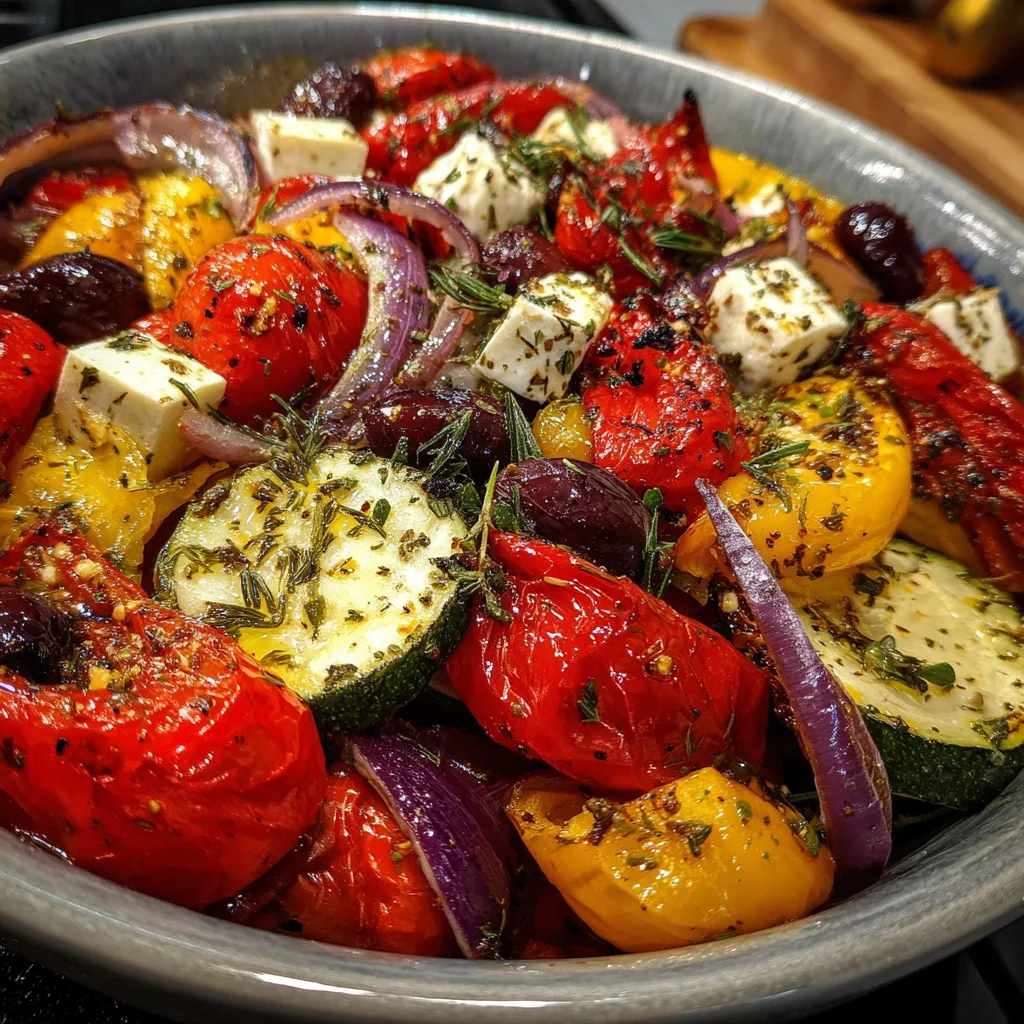 One-Pan Greek Vegetables is a vibrant and easy roasted dish featuring zucchini, bell peppers, red onion, tomatoes, and olives tossed with olive oil, garlic, and Mediterranean herbs, all baked together for a flavorful and healthy side.