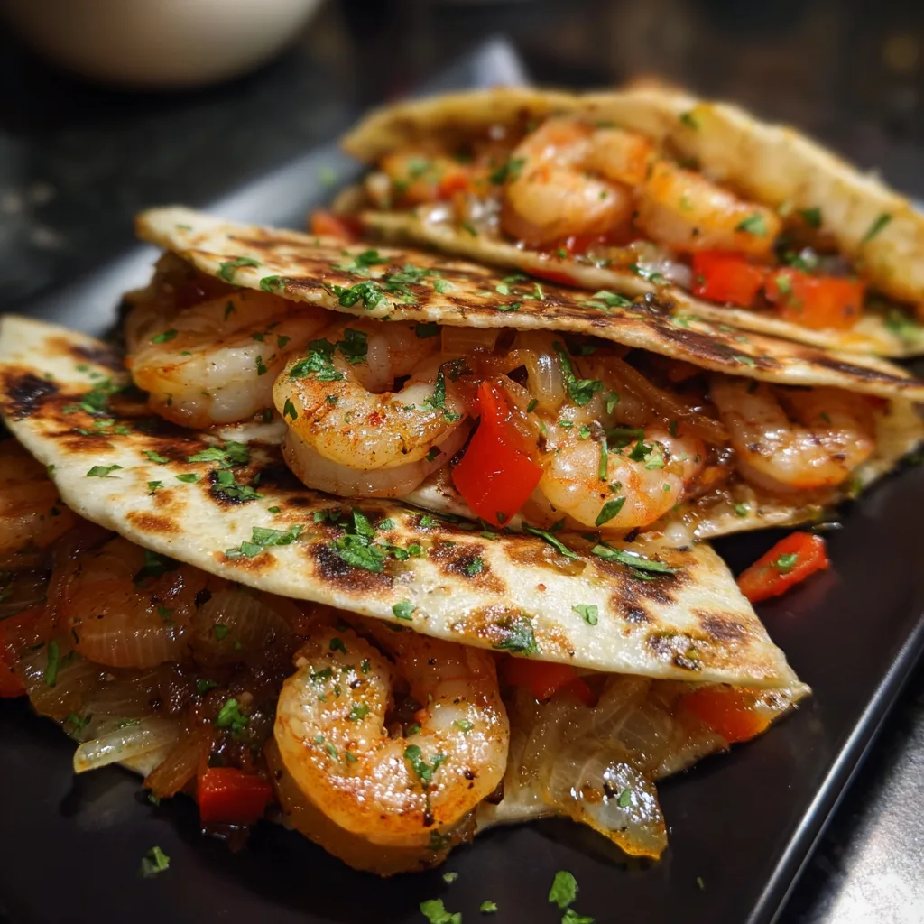 Crispy shrimp quesadillas filled with sautéed bell peppers, onions, melted cheese, and seasoned shrimp, perfect for a quick and flavorful meal.