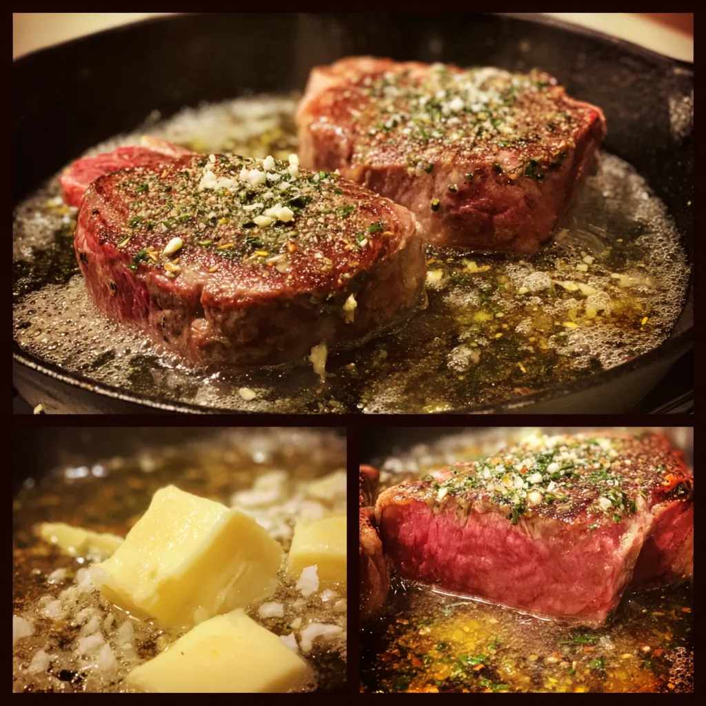 Reduce the heat to medium and add the butter, minced garlic, rosemary, and thyme to the pan. As the butter melts, tilt the skillet slightly and spoon the melted garlic butter continuously over the steaks for 1–2 minutes. This basting technique enhances flavor and ensures even cooking.